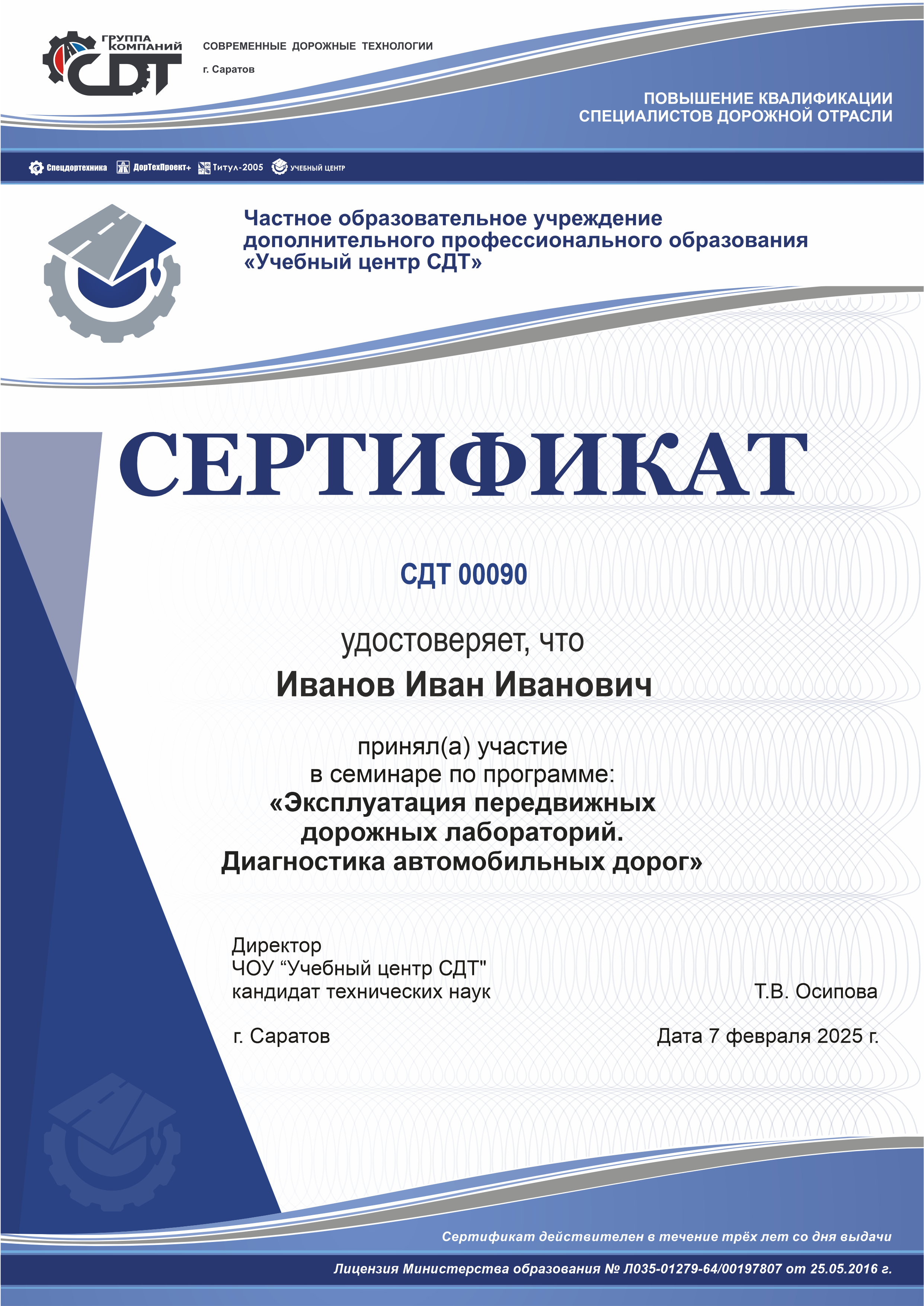Эксперты и ведущие специалисты группы компаний «СДТ» участвуют в проведении обучения и повышения квалификации работников дорожного хозяйства различных регионов России, а также Чеченской республики, Белоруссии и Казахстана.